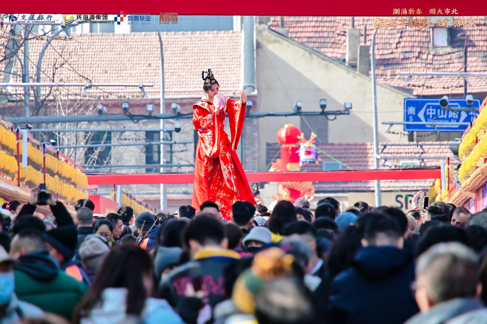 暖阳下,身着锦绣红袍的表演者衣袂飘飘,在高台上轻盈晃动,时而轻挥水袖,时而俯身探向人群,将糖果送到观众手中。快门声、欢笑声、喝彩声交织,市民游客纷纷伸手互动,接到甜蜜的瞬间,现场掀起阵阵欢呼。