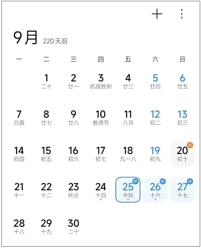中秋节:9月25日(周五)至27日(周日)放假,共3天。