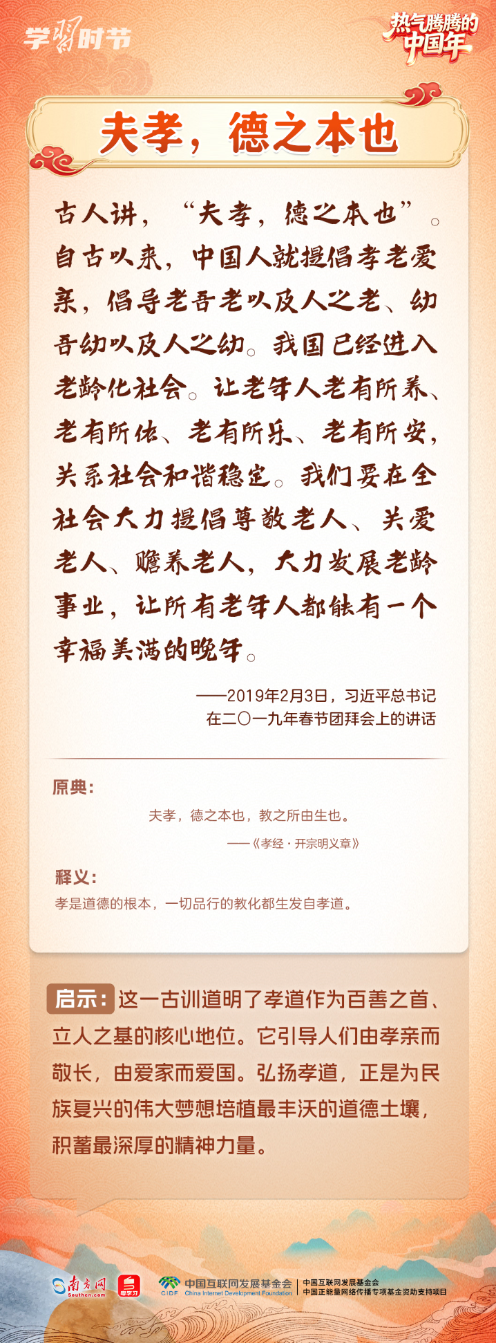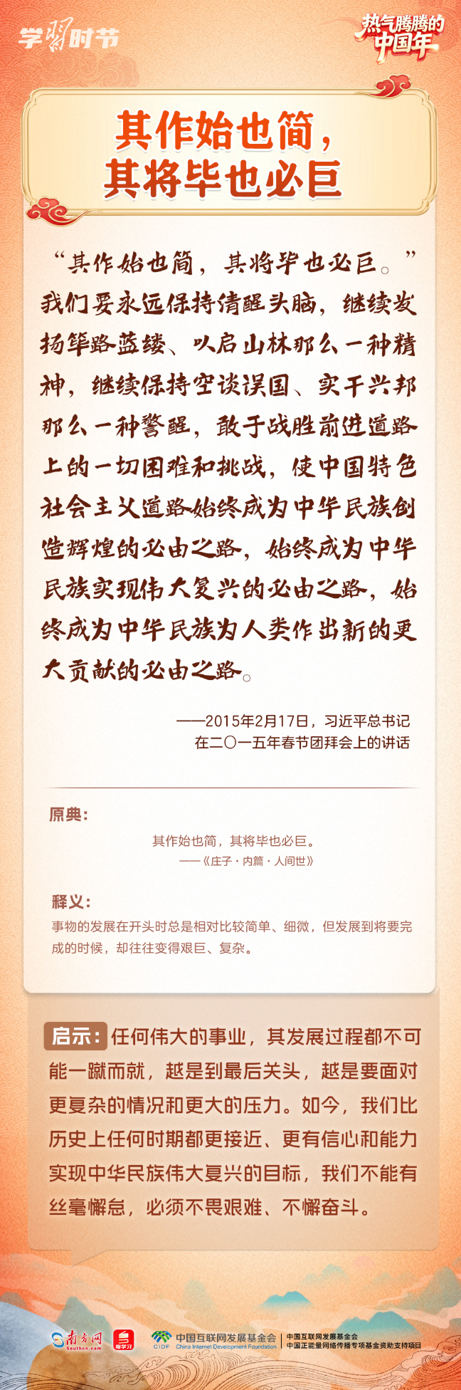 “在中国式现代化新征程上策马扬鞭、勇往直前,共同开创更加美好的未来。”2月14日,在二〇二六年春节团拜会上,习近平总书记的重要讲话振奋人心。党的十八大以来,习近平总书记多次在春节团拜会上发表重要讲话,回望旧岁、展望新年,向大家致以美好的新春祝福。在讲话中,习近平总书记常常巧妙引用古典名句砥砺人心,指引我们脚踏实地、锐意前行,提醒我们珍视亲情、涵养孝道。一起来学习感悟。