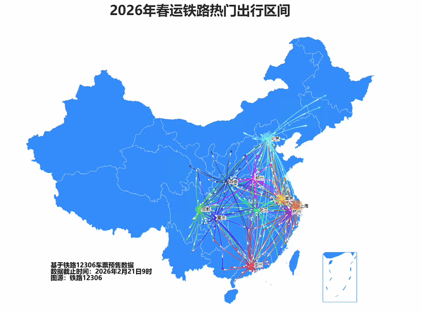 截至2月21日8时,铁路12306(含网站、客户端等)已累计发售春运期间火车票超3.1亿张。从预售情况来看,今日主要热门出发城市有北京、广州、成都、重庆、武汉、上海、西安、郑州、杭州、南京;主要热门到达城市有北京、广州、上海、深圳、成都、杭州、武汉、重庆、西安、郑州;南宁至广州、北京至上海、沈阳至北京、武汉至上海、武汉至深圳、西安往返成都、武汉至广州等热门区间客流相对集中。从余票情况看,2月22日至2月23日,上海至徐州、合肥、温州、郑州、长沙,广州至南宁、长沙,深圳至长沙,杭州至阜阳等区间余票充足;北京至哈尔滨、郑州、包头、呼和浩特,福州至北京,上海至阜阳、亳州,广州至贵阳,西安至兰州,沈阳至哈尔滨等区间尚有余票。2月24日至3月3日,北京往返上海,上海往返温州、徐州,长沙往返深圳,上海至合肥、武汉等区间余票充足;北京至太原、邯郸,福州至北京,上海至阜阳、深圳,昆明至成都,杭州至合肥,沈阳至哈尔滨,贵阳至昆明,合肥至温州等区间尚有余票。