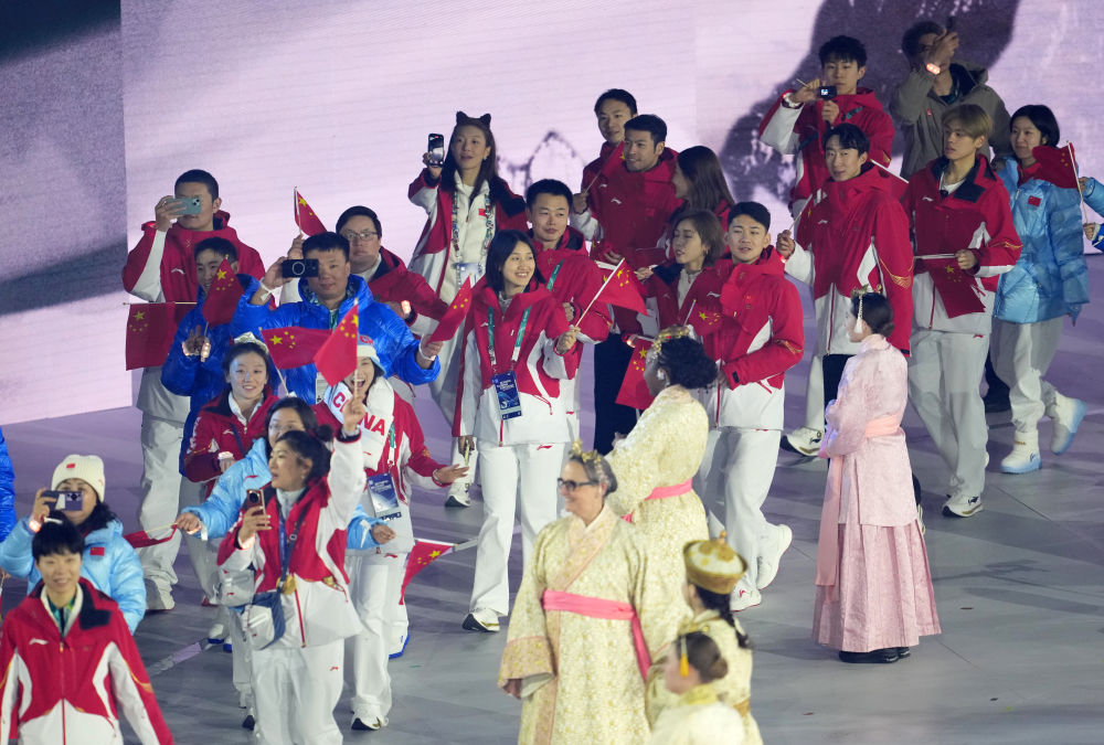运动员入场仪式环节,各个代表团的旗帜入场。中国代表团旗手苏翊鸣手持五星红旗入场!在男子坡面障碍技巧项目上,苏翊鸣为中国代表团摘取了本届冬奥会的首金,此外,他还获得了男子大跳台的铜牌,这也是中国体育代表团在本届冬奥会取得的首枚奖牌。