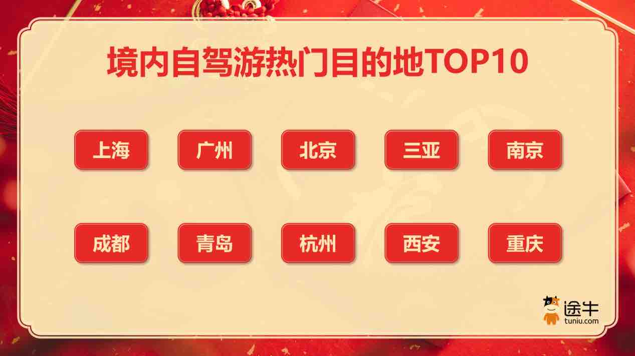 从境内游出游方式来看,自驾游及自由行成为途牛用户的主流之选,出游人次占比分别为53%和29%。自驾游热门目的地中,上海、广州、北京、三亚、南京、成都、青岛、杭州、西安、重庆等是更为热门的选择。上海迪士尼度假区、珠海长隆度假区、广州长隆度假区、北京环球度假区、哈尔滨冰雪大世界等“酒店+主题乐园门票”“酒店+门票”等自驾游产品预订热度高涨。
