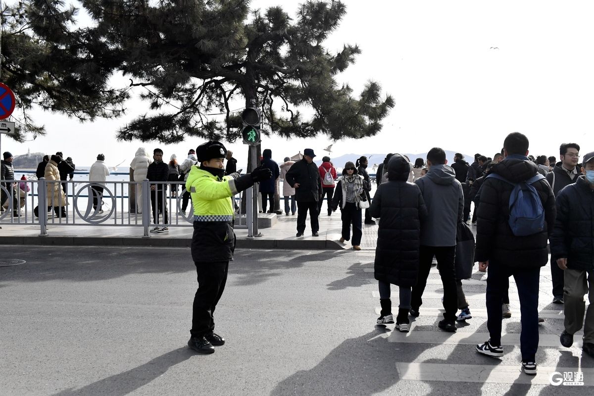 大年初一开始,中山路、栈桥、大鲍岛糖球会等景点迎来旅游高峰,景区周边人流车流密集。公安交管部门细化落实管控措施,动态监测城区主干道、高架路、热门景点、主要商圈等重点区域交通流量,及时采取临时道路管控措施,科学调整路面勤务安排,并在道路诱导屏、导航软件等平台及时发布路况和周边停车场信息,保障交通运行平稳。针对假期景点周边人流密集且出行方式多样的特性,交管部门在景区周边设立交通安全宣传点和游客服务站,开展“拒绝酒醉驾”“一盔一带”“拒绝疲劳驾驶”等交通安全主题宣传教育,不断增强群众安全出行意识,并主动为广大群众出行、旅游提供优质服务。