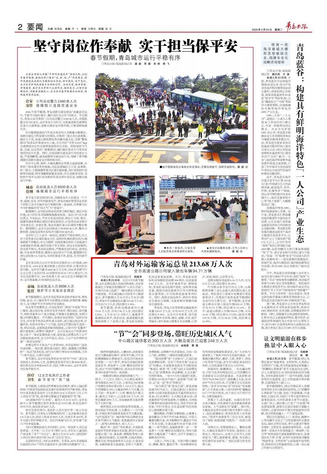 青岛日报社/观海新闻讯 长达9天的春节假期,全社会跨区域人员流动热情高,这场承载着亿万家庭团圆期盼的“人员大迁徙”,在神州大地上绘就了一幅充满活力的流动中国画卷。市交通运输公共服务中心数据显示,春节假期(2月15日至2月23日)期间,青岛对外运输客运总量213.68万人次,日均23.74万人次,同比增长9.45%。