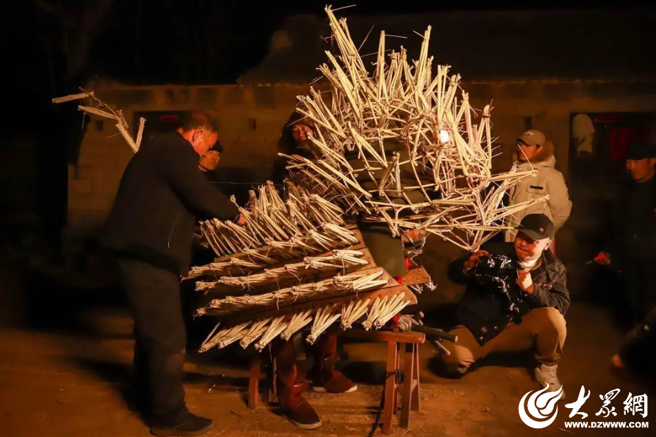 “火虎”表演由顶虎人与打虎人构成,距今已有百余年历史,由邹城市平阳寺村周氏族人,融合传统舞狮技艺与民间礼花筋表演创新演变而来。礼花筋俗称火捻子,其燃料由村民采用木炭特制而成,制作工序十分繁复。想要呈现一场精彩的火虎表演,并非易事。不同于普通的民俗表演,火虎演出有着严格的人员和筹备要求,一场表演至少需要十五六位表演者通力合作,从火捻准备到虎头制作,整体筹备周期长达半个月左右。表演前,村民以毛毡纸包裹炭灰制成火捻,再将其逐一插装在带孔的虎形背板与藤条编织的虎头之上;打虎人的帽子、腿部与背部,同样需要用火捻子精心装点。一块虎背板上便有一千多个孔洞,每个孔中要插入三根火捻,一场完整的火虎表演,至少需要准备三千六百多根火捻子,单是穿戴装备就需众人协助。