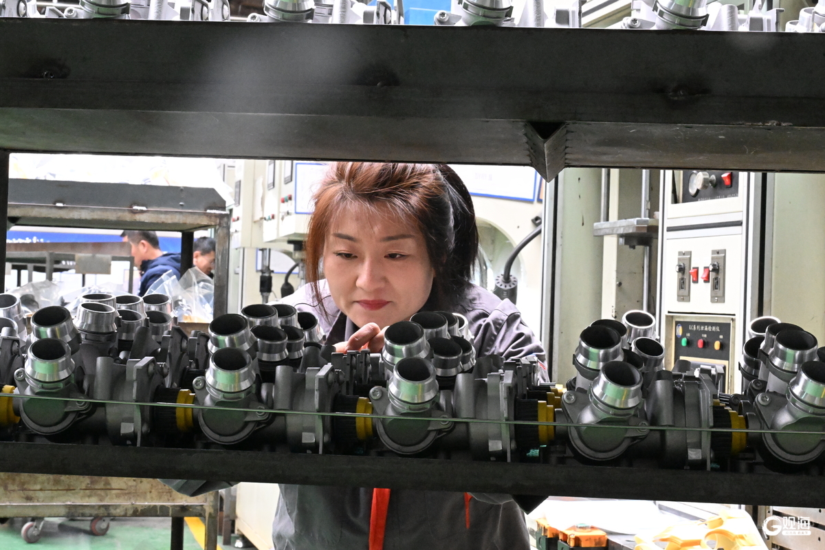 2月24日,在位于山东省青岛市即墨区环秀街道的青岛德利丰机械有限公司车间内,工人在检测产品。