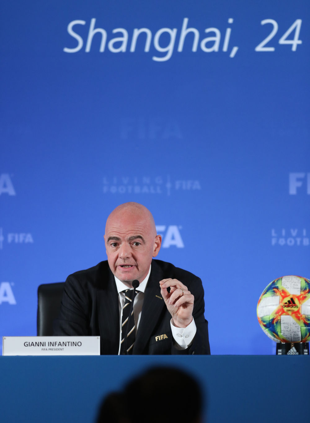 2019年10月24日,国际足联主席因凡蒂诺在上海举行的国际足联理事会新闻发布会上讲话。新华社记者 丁汀 摄