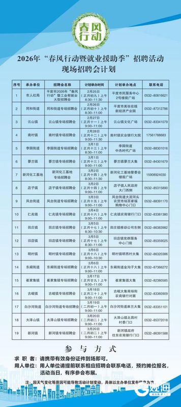 此次招聘会正式拉开平度2026年“春风行动”系列招聘活动序幕,平度市人社局将联动各镇(街道),开展“春风行动”系列送岗下乡招聘会,精准对接企业用工需求、全力缓解节后用工缺口,用心用情为广大求职者配齐“家门口”的优质岗位,把就业服务送到群众身边、暖到百姓心坎。(青岛日报/观海新闻记者 黄光丽 通讯员 孙雪怡)