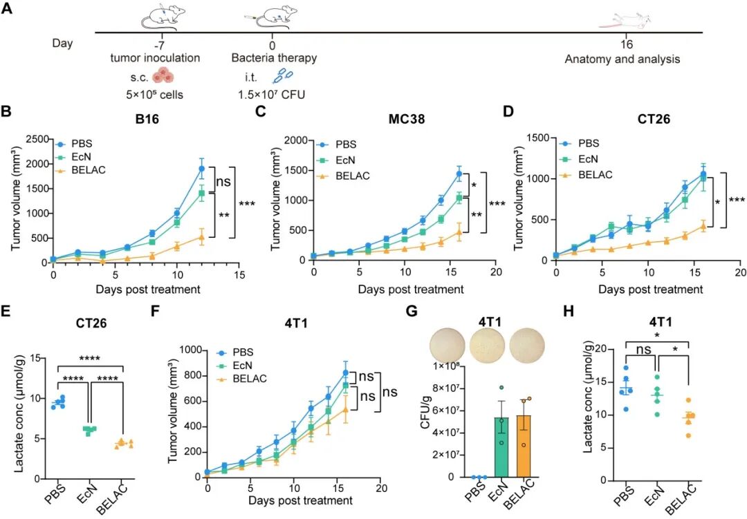 基于这一发现,研究团队推测:如果增强EcN的乳酸代谢能力,是否能大幅提升其疗效?团队采用基因组整合策略,将强化后的乳酸代谢基因盒稳定整合到EcN染色体中,成功构建了一株无质粒、基因组稳定、具有超强乳酸代谢能力的工程菌株,命名为BELAC(Bacteria with Enhanced LActate Consumption)。在B16、MC38和CT26等多种小鼠同源肿瘤模型中,BELAC展现出优异的抗肿瘤效果和安全性。值得注意的是,研究也客观指出,在免疫原性极低的“冷”肿瘤(如4T1乳腺癌)模型中,单靠清除乳酸尚不足以完全抑制肿瘤,这提示未来可将BELAC与免疫检查点抑制剂等疗法联用,以攻克更难治的肿瘤类型。