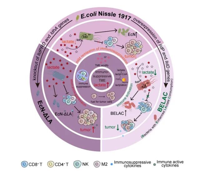 该研究首次揭示了乳酸代谢是益生菌大肠杆菌Nissle 1917(EcN)发挥抗肿瘤活性的关键机制,并成功构建了一种具有超强乳酸代谢能力的工程化菌株BELAC。该菌株能高效清除肿瘤微环境中的乳酸,逆转免疫抑制状态,显著激活机体抗肿瘤免疫反应,为开发新一代安全、高效的细菌免疫疗法提供了全新的策略和理论依据。