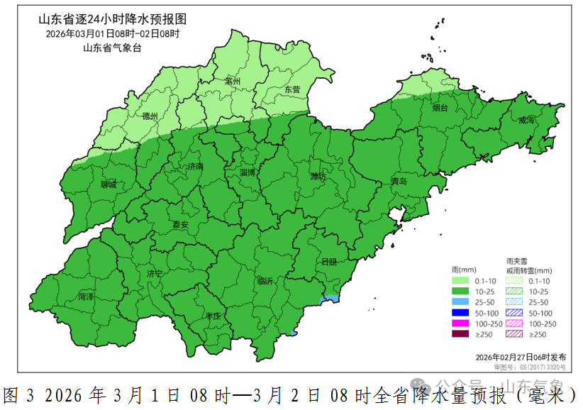 3月1日白天到夜间,全省天气阴有小到中雨。东北风,南部沿海地区5~6级阵风7级,其他地区4~5级阵风6级。夜间最低气温:鲁中山区和鲁西北地区0℃左右,其他地区3℃左右。最高气温:鲁中山区4℃左右,其他地区6℃左右。
