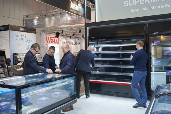 在产品展区,以“超级展示”为核心的全透玻璃门整机风幕柜、5面玻璃透明风道风冷双温岛柜为代表,以多层循环全域均温风幕技术与R290并联多通道节能技术为核心的大超顶置机组商超玻璃门冷冻柜、顶置机组风幕柜双双亮相,产品凭借精准控温技术与高效节能表现,成为现场焦点。其中,搭载双系统制冷架构的商超陈列柜,实现了冷藏、冷冻灵活转变,实用性得到极大的提升,搭配-18℃速冻技术,可快速锁住食材原生风味,完美适配欧洲高端商超、烘焙连锁的食材保鲜需求,赢得了众多欧洲零售商的青睐。