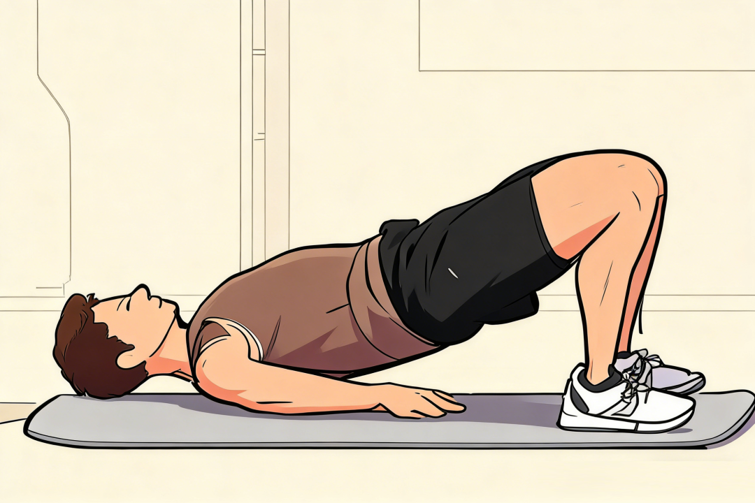 仰卧躺在地面,双膝弯曲约90度,脚掌平放,双手置于身体两侧。缓慢抬起臀部,直到肩膀、髋部、膝盖形成直线,在顶点收紧臀部和腰腹,保持1~2秒后缓慢放下。