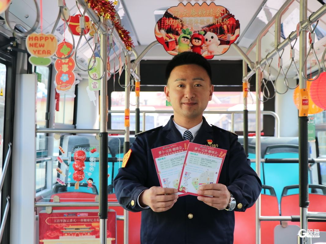 此外,302路驾驶员董述飞在车厢内张贴了“五百年海云香火·一串糖球忆青岛”主题海报,讲述了海云庵糖球会的起源,还有“咬春”“十六踩圆”等本地特有的年俗故事。青萝卜“咯嘣脆”,寓意精神饱满迎新岁;糖球“甜丝丝”,祈愿生活红火平安。“希望能让更多人了解我们青岛民俗文化,同时也祝愿乘客们阖家团圆美满!”董述飞说道。