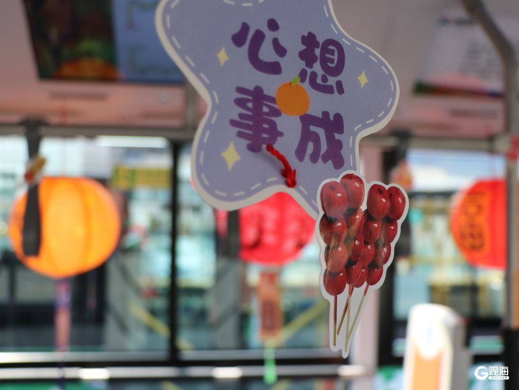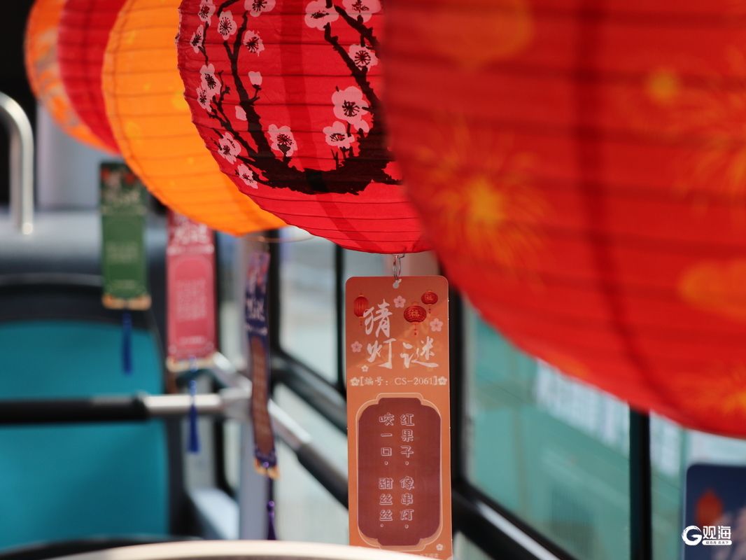 走进302路DD2480主题车厢,扶手处挂满一串串冰糖葫芦,红彤彤的果实仿佛刚出锅的糖球,其间点缀着马年灯谜小卡片,谜面融合交通安全与民俗知识,让乘客出行既添趣味,又涨知识。车厢后部还悬挂着国风灯笼,车窗上贴有卡通糖球、元宵等图案,瞬间唤醒人们对童年春节的美好回忆。