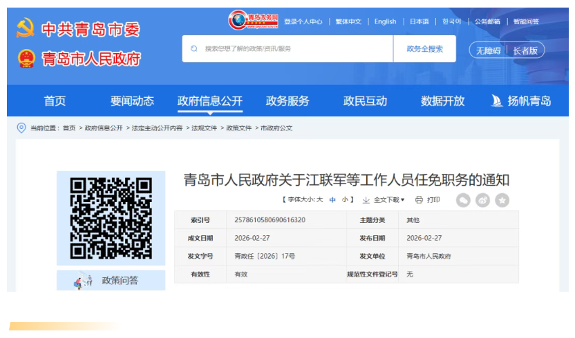 江联军为青岛市人民政府副秘书长、办公厅主任;