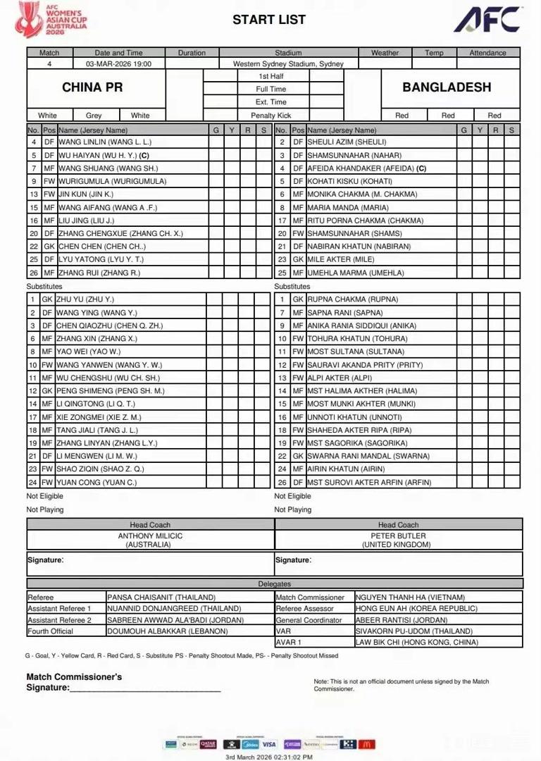 北京时间3月3日下午4时,中国女足将迎来2026年女足亚洲杯首场小组赛,对阵孟加拉国队。刚刚,中国女足首发出炉,主帅米利西奇在前场派出王霜、金坤、乌日古木拉的组合。
