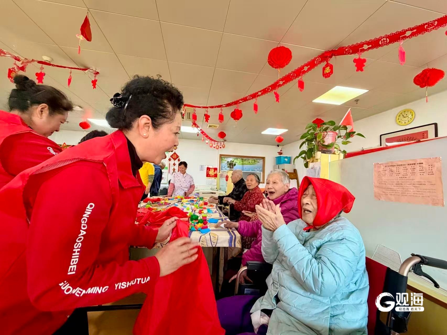 志愿者与养老院的老人一起活动