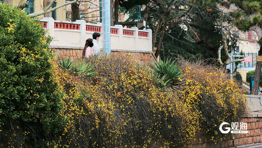 莱阳路一侧的迎春花已次第绽放。梁超 摄