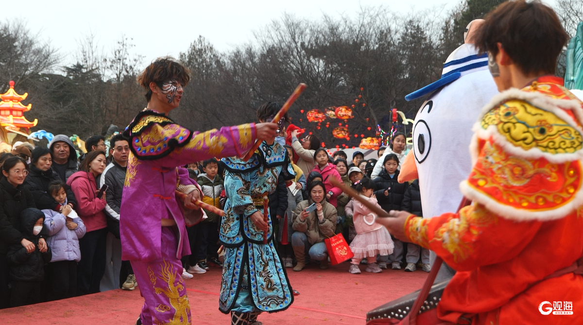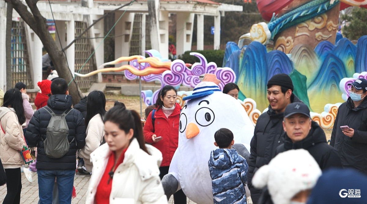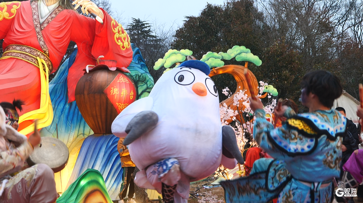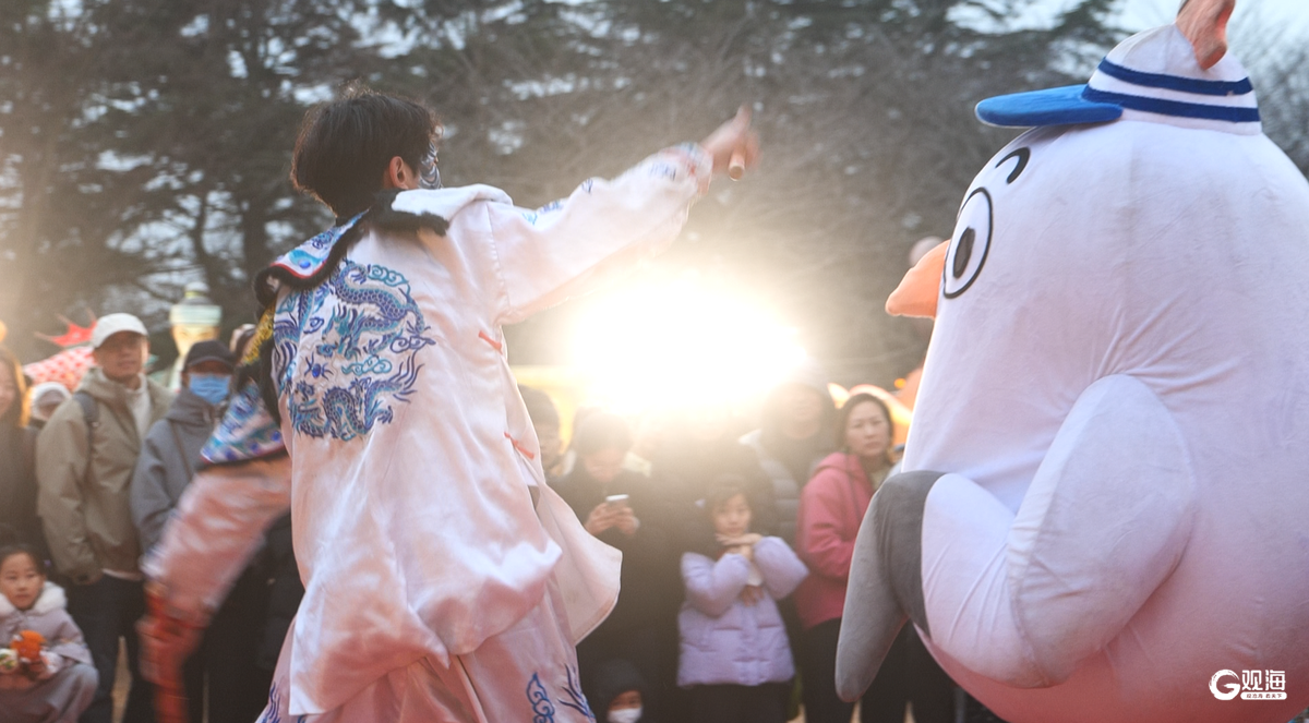 青岛日报社/观海新闻3月4日讯 3月3日,青岛海鸥季“鸥啦和它的朋友们”空降巡游活动走进中山公园灯会,与市民游客共庆佳节。活动现场,可爱的海鸥IP形象与英歌舞演员、网红熊猫惊喜联动,共同表演国家级非遗英歌舞,刚劲舞姿与萌趣互动相映成趣。