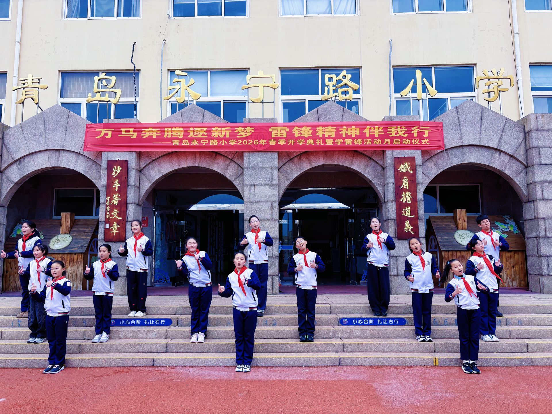 青岛永宁路小学在报到当天以“万马奔腾逐新梦 雷锋精神伴我行”为主题,举行了春季开学典礼暨学雷锋活动月启动仪式。该校党支部专职副书记王辉围绕“雷锋精神伴成长”主题,开讲开学思政课,字字句句饱含谆谆教诲与殷切期望,他鼓励学生日行一善,从身边小事做起,传承雷锋精神,争做时代新人。师生齐唱《学习雷锋好榜样》等活动让雷锋精神的种子在队员心中生根发芽,助人为乐、勇于担当的美德在校园中传递。
