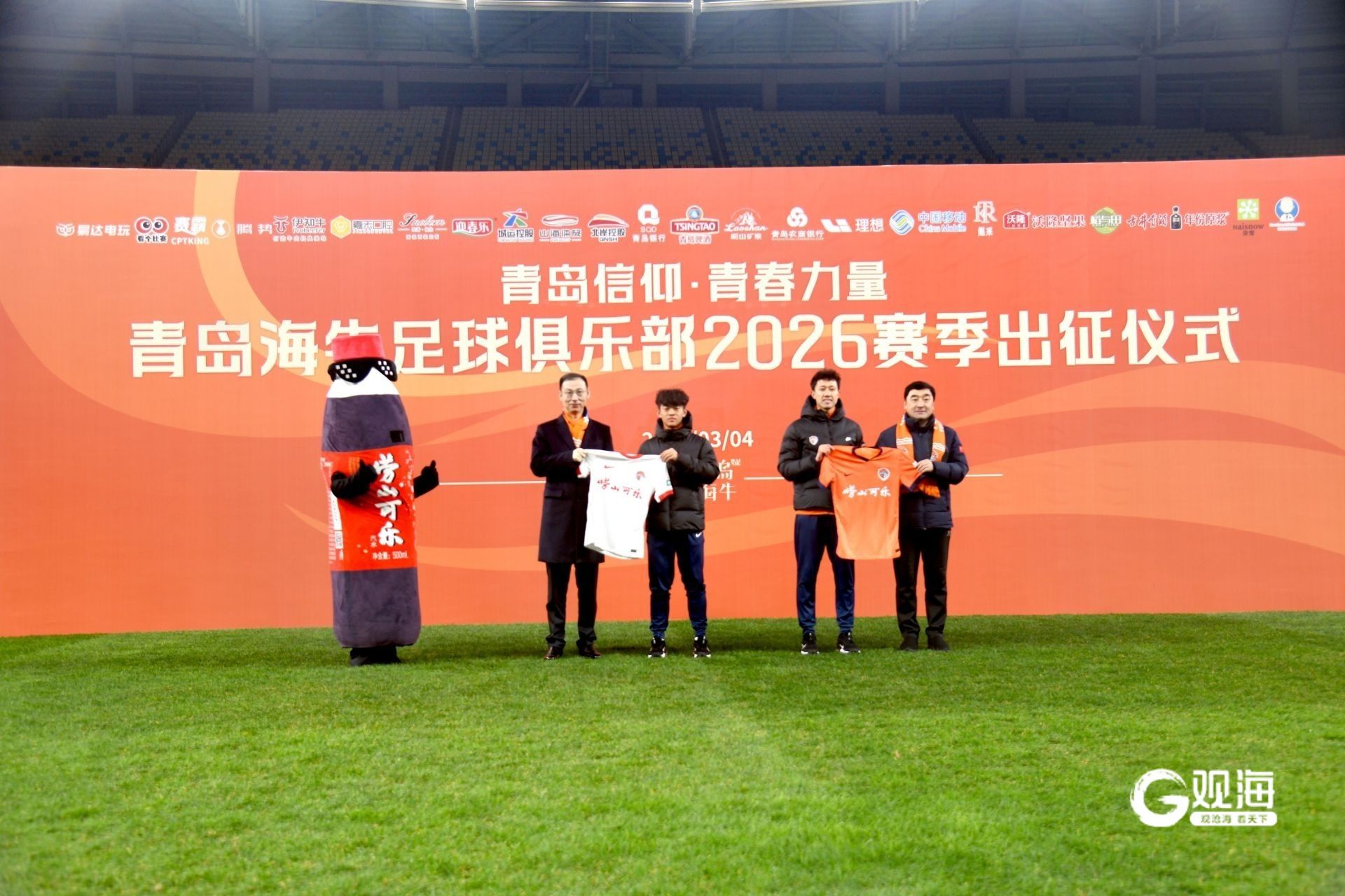 2026赛季,青岛海牛足球俱乐部将携手青岛本土品牌青岛啤酒、青岛饮料集团、青岛银行、青岛农商银行一同为这座城市的荣誉而战,出征仪式中,俱乐部与该4大品牌进行了签约仪式,携手向前。活动期间,新赛季球衣由部分球员展示,胸前广告“崂山可乐”首次亮相。