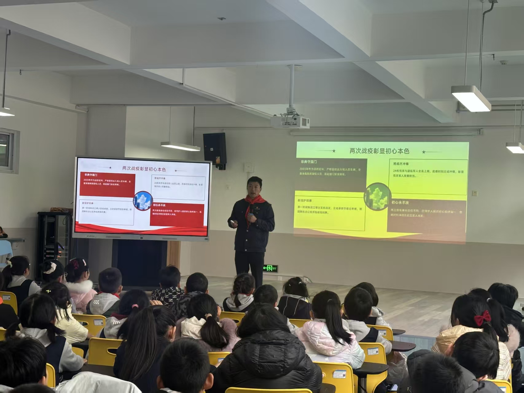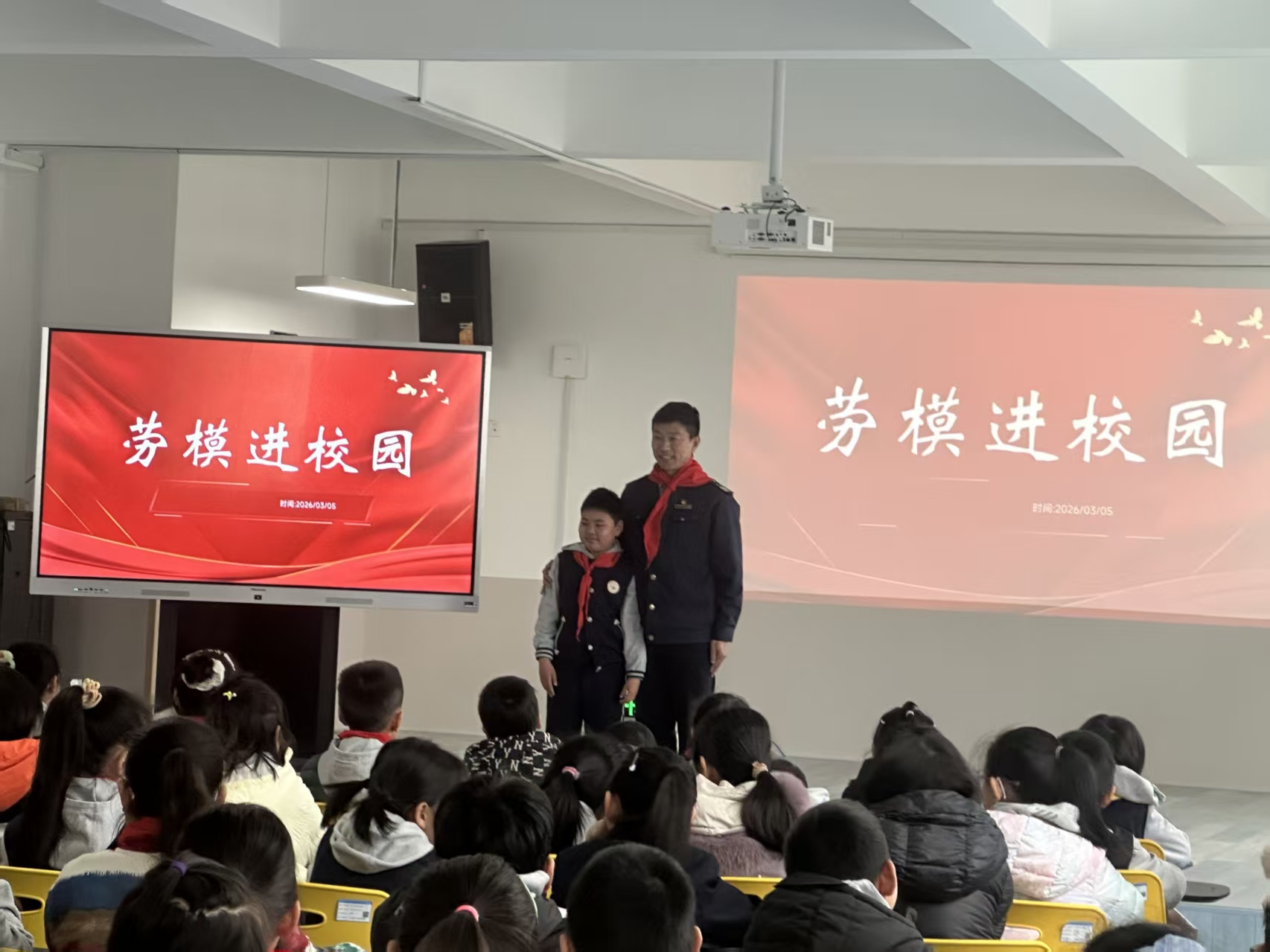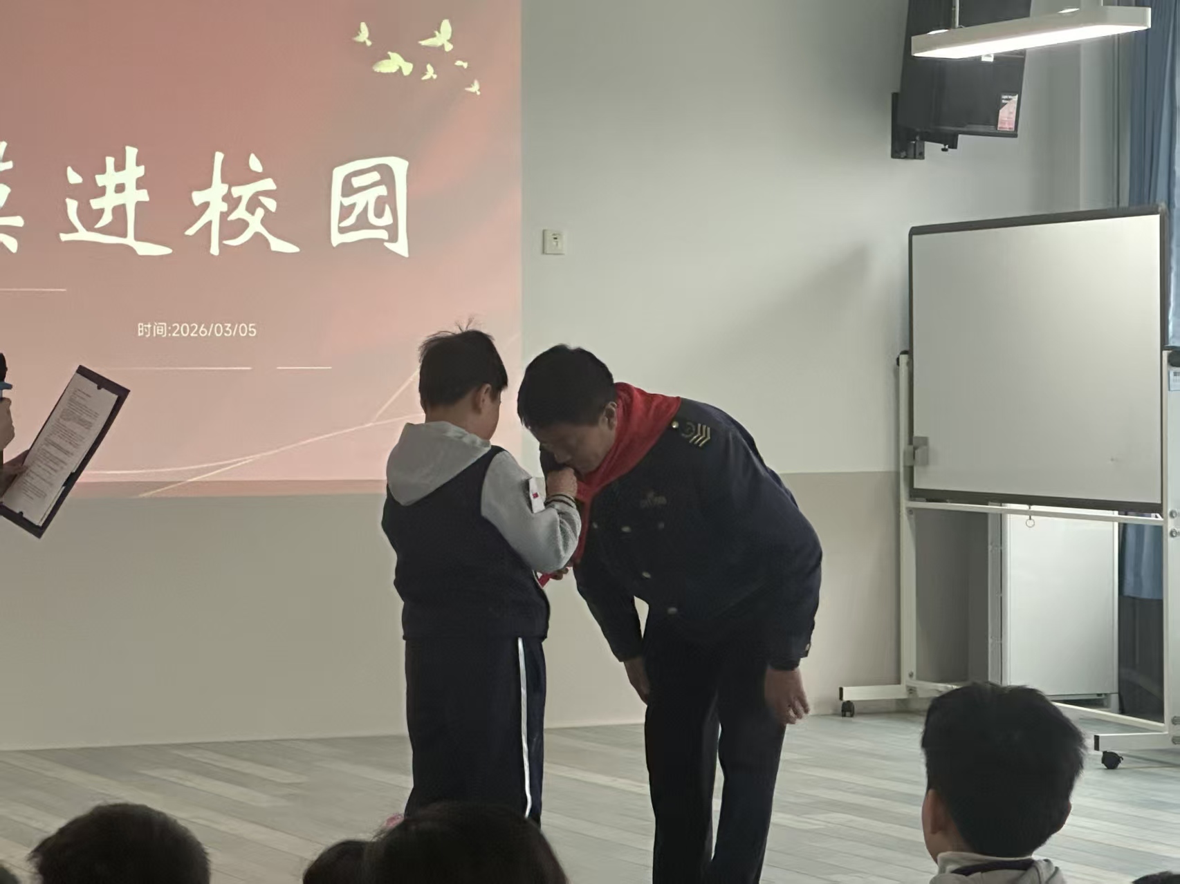 为了让孩子们更真切地理解雷锋精神,活动还特别邀请了温馨巴士622路驾驶员贾立杰。作为一名退伍军人和共产党员,贾立杰将军人的纪律与党员的担当融入到十米车厢。面对台下稚嫩的面孔,他分享了自己在部队时以雷锋为榜样的成长经历,以及如今在公交岗位上服务乘客、工作之余关爱社区独居老人的真实故事。没有华丽的辞藻,只有一个个朴实而温暖的瞬间,让在场的师生们深受感动,现场不时响起热烈的掌声。