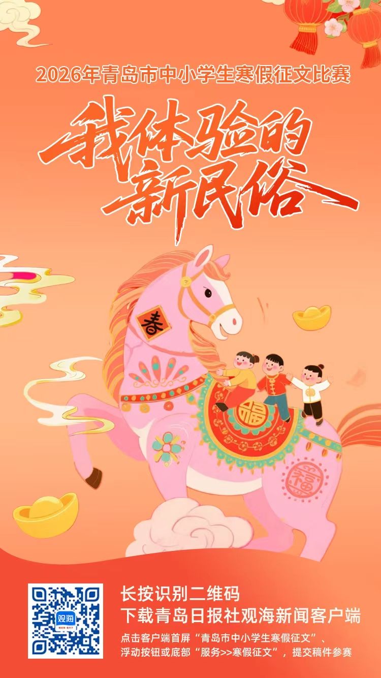 寒假如约开启,由青岛市教育局、青岛日报社联合主办,青岛市天泰公益基金会支持的2026年青岛市中小学生寒假征文比赛4日起正式启动。此次征文主题是“我体验的新民俗”。