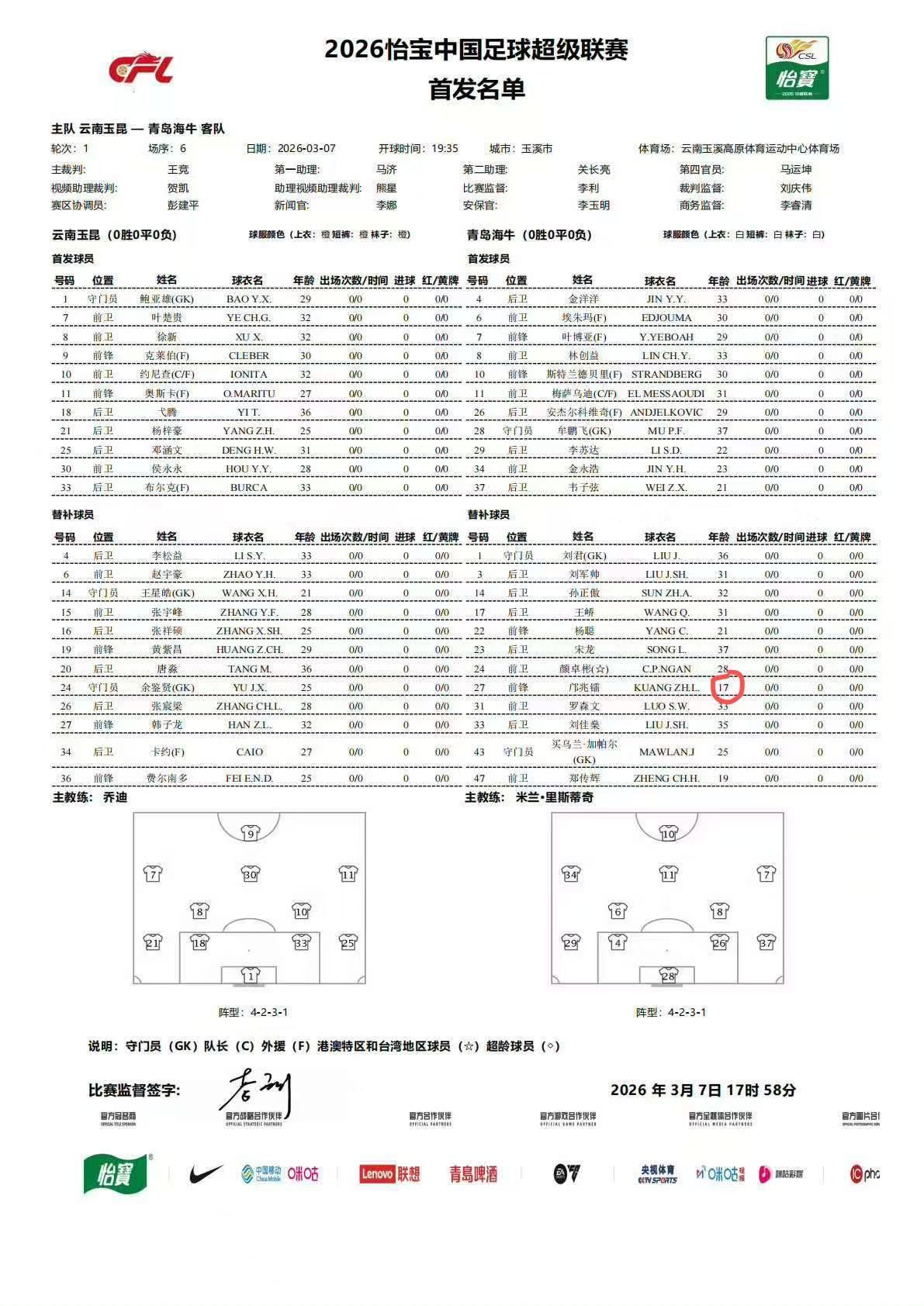 青岛日报社/观海新闻3月7日讯 今晚19:35,青岛海牛队将在本赛季首场中超比赛中客场挑战云南玉昆。正如主帅米兰赛前所说,他将给青岛球迷带来不一样的感觉。从已经公布的首发阵容名单看,海牛玩起了“大变脸”。