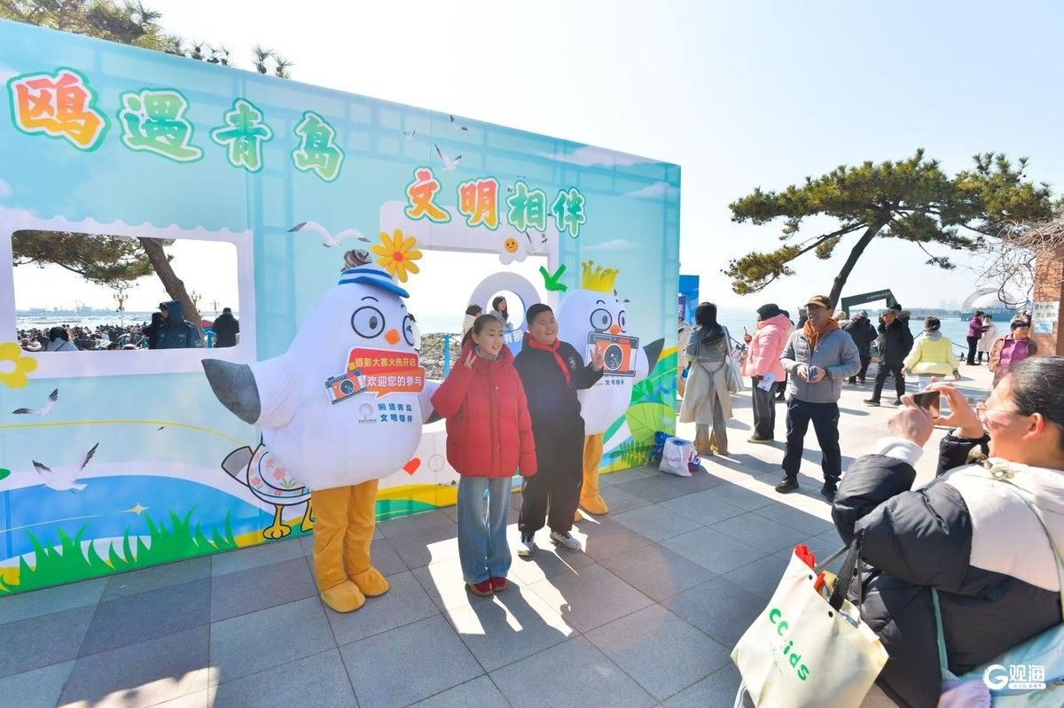 光影定格,鸥遇美好传递全城。现场两位可爱的“文明观鸥”吉祥物“鸥啦”化身特别宣传员,手持“相机”卡牌与市民游客亲切互动、合影留念,在传递文明观鸥理念的同时,也正式发布了“浪花朵朵 海鸥对对”——“鸥”遇良缘摄影大赛相关安排,邀约广大市民和游客用镜头捕捉灵动瞬间、定格人鸥温情,让青岛的生态之美与城市温暖传递给更多人。