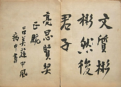 一些零碎的消息,由知情人从青岛传到南京再披露出来,成为关于吕美荪晚年状况的稀缺文献凭证。1944年《同声月刊》刊登匑庵《青岛视吕美荪疾》,隐约透露吕氏“风痹舌僵”,说话困难。这与其晚年因高血压中风病危曾获刘季三诊治的说法吻合。本地名医的挽救,将诗人的生命延续到了1945年战后,终无力回天。至此,吕氏四女均香消玉殒。中风后,吕美荪书“文质彬彬然后君子”赠人,从笔力看气韵尚足。“文质彬彬”几个字,1933年蔡元培也在青岛写过,是给上海路崇德中学的题词,吕美荪书写这八个字的时候,“君子”蔡元培已在香港逝世。(李明)
