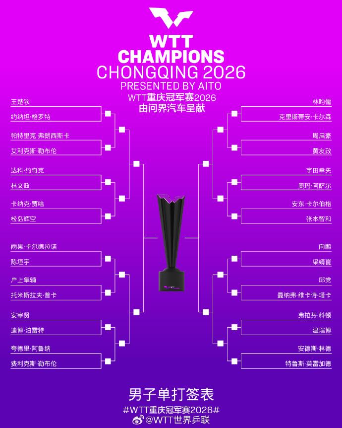 王楚钦、陈垣宇位列上半区,其他五位队员都在下半区,其中首轮国乒就将迎来德比战,周启豪首轮迎战队友黄友政,向鹏首轮战队友梁靖崑,另外一位国乒队员温瑞博也分在下半区。
