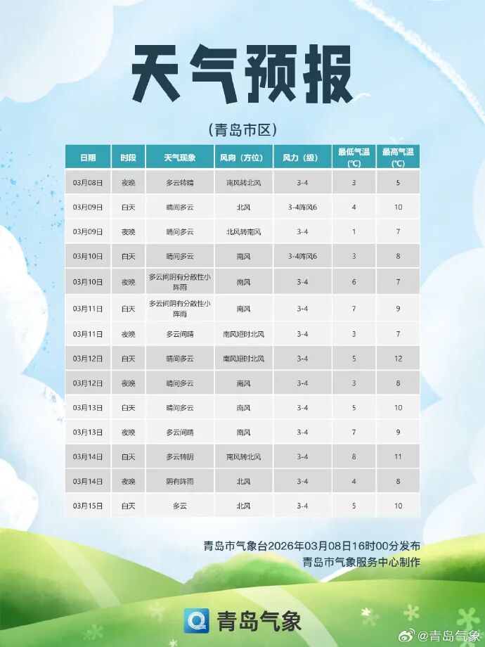 ●据@青岛气象 最新预报,本周我市以多云间晴天气为主,10日夜间和14日有分散性小阵雨。详情>>>