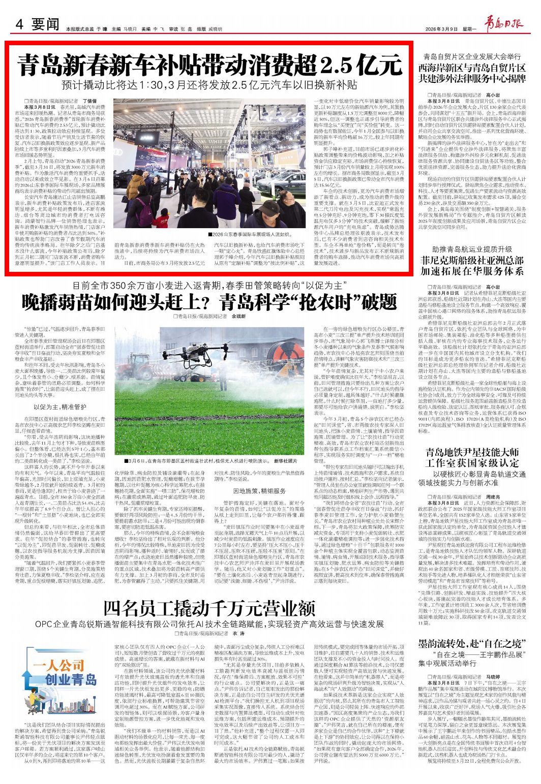2月上旬,青岛启动“2026青岛新春消费季”,截至3月31日,将发放3000万元新车消费补贴。作为激活汽车消费的重要抓手,活动启动以来成效立竿见影。在3月6日启幕的2026山东春季国际车展现场,多家品牌展商均表示消费补贴的带动作用超出预期。