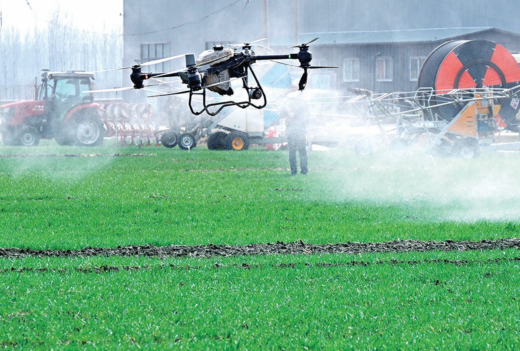 3月6日,在青岛市即墨区蓝村街道壮武村,植保无人机进行喷防演示。 新华社照片