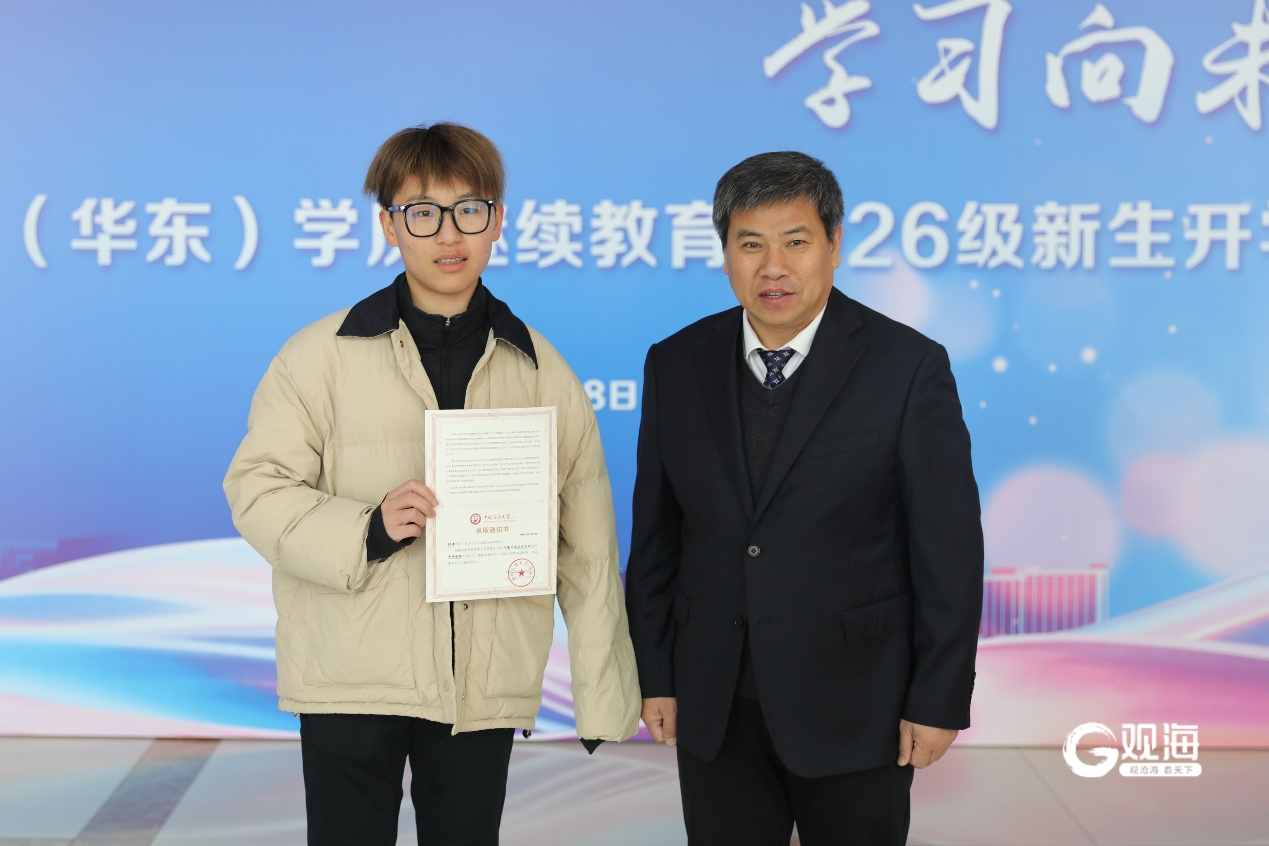 中国石油大学(华东)教育发展中心党委书记、远程教育学院院长姚海田为邵倩颁发录取通知书。