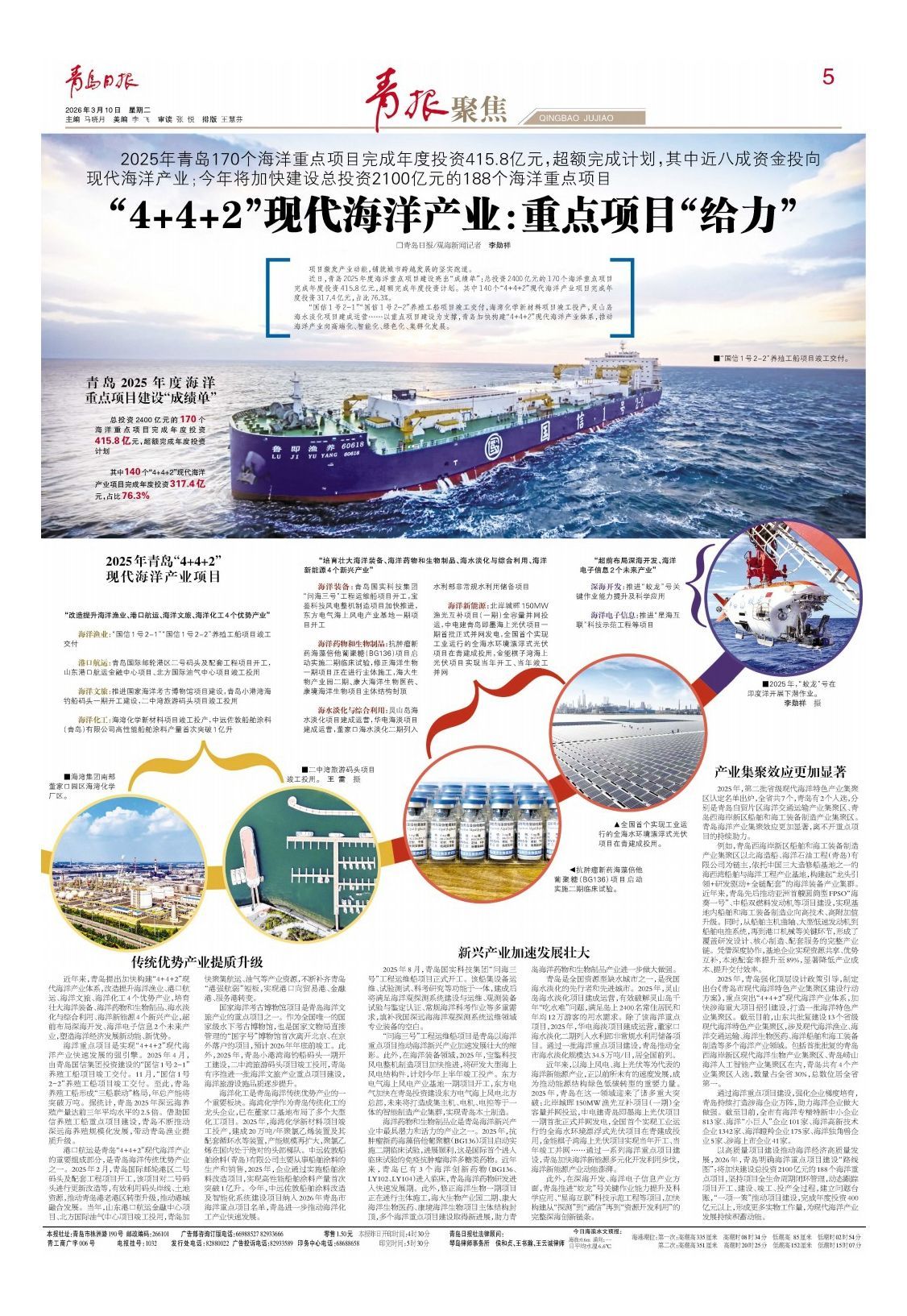 “国信1号2-1”“国信1号2-2”养殖工船项目竣工交付,海湾化学新材料项目竣工投产,灵山岛海水淡化项目建成运营……以重点项目建设为支撑,青岛加快构建“4+4+2”现代海洋产业体系,推动海洋产业向高端化、智能化、绿色化、集群化发展。
