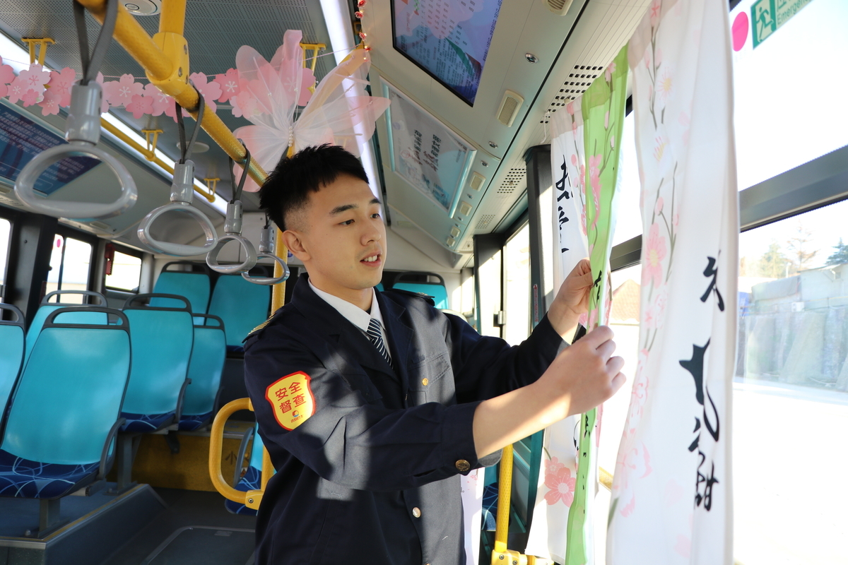 为了让乘客从上车那一刻起就沉浸于梅花节的美好氛围,213路驾驶员江世纪在DD1832号车上精心打造“‘梅’景如画”主题车厢。车窗上张贴着梅花主题窗贴,扶手杆间点缀着栩栩如生的仿真梅花,车厢内仿佛移动的梅园,让乘客在行车途中提前感受梅花绽放。