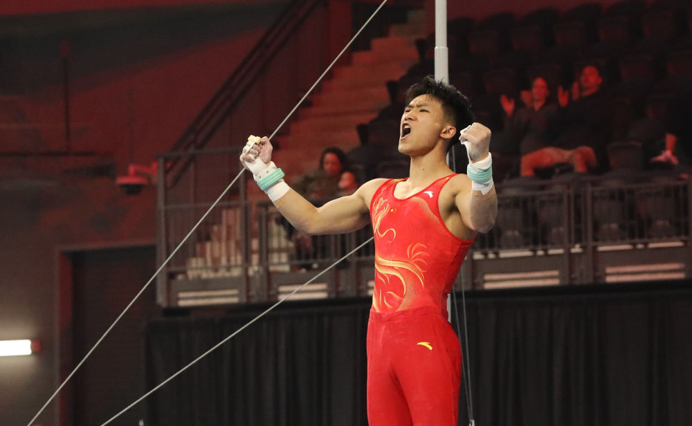 3月7日,中国队选手李鸿颜在男子单杠比赛后。新华社发(曾慧摄)