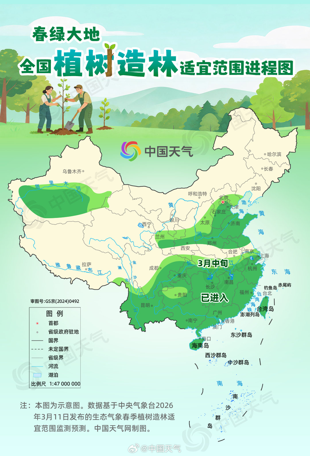 植此青绿,共树春晖。今天(3月12日)是植树节,一个与春天“植”得约定的日子。据国家林草局最新数据显示,我国森林面积达36.14亿亩,覆盖率提升至25.09%,是全球“增绿”最多最快的国家。中国天气联合国家气象中心特别推出2026全国植树造林适宜范围进程图,一图了解南北方各地最佳植树时段。