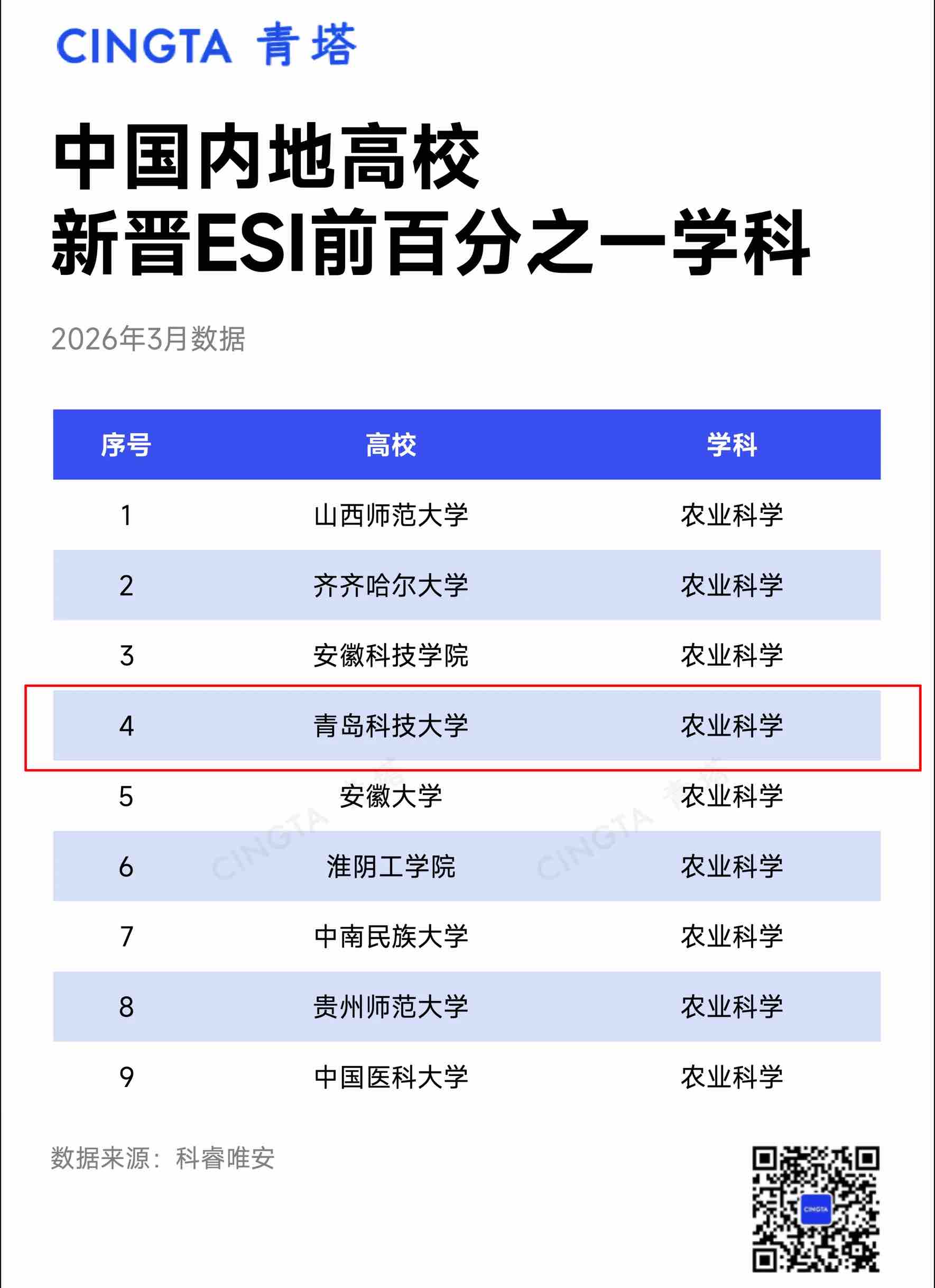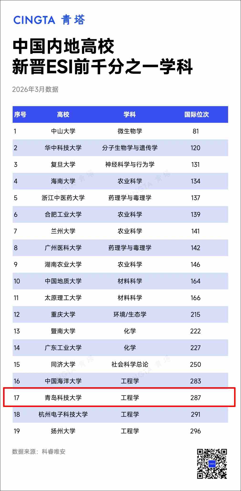 近年来,青岛科技大学始终将学科建设作为引领高质量发展的“龙头工程”,举全校之力推进“811”项目建设,通过“化工引领、全校协同、行业赋能、内外联动”的建设思路,着力构建特色鲜明、优势突出的一流学科建设体系。此次工程学进入全球前1‰、农业科学进入全球前1%,正是这一建设思路在理工农等领域产生深度交叉融合效应的生动体现。工程学是支撑学校优势特色的核心学科之一,进入全球前1‰,表明其在基础研究、成果产出与学术影响力方面达到世界一流水平;农业科学的迅速崛起,展现了学校在生物基材料、绿色化工等交叉领域的创新潜力。