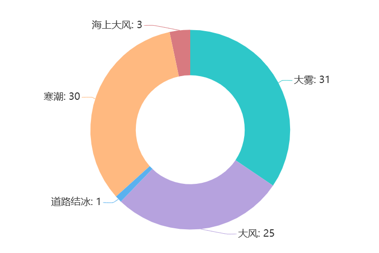 在今年2月份发布的预警信号种类中,大雾预警信号发布次数最多,为31次,紧随其后的是寒潮预警信号,今年2月份共发布寒潮预警信号30次。