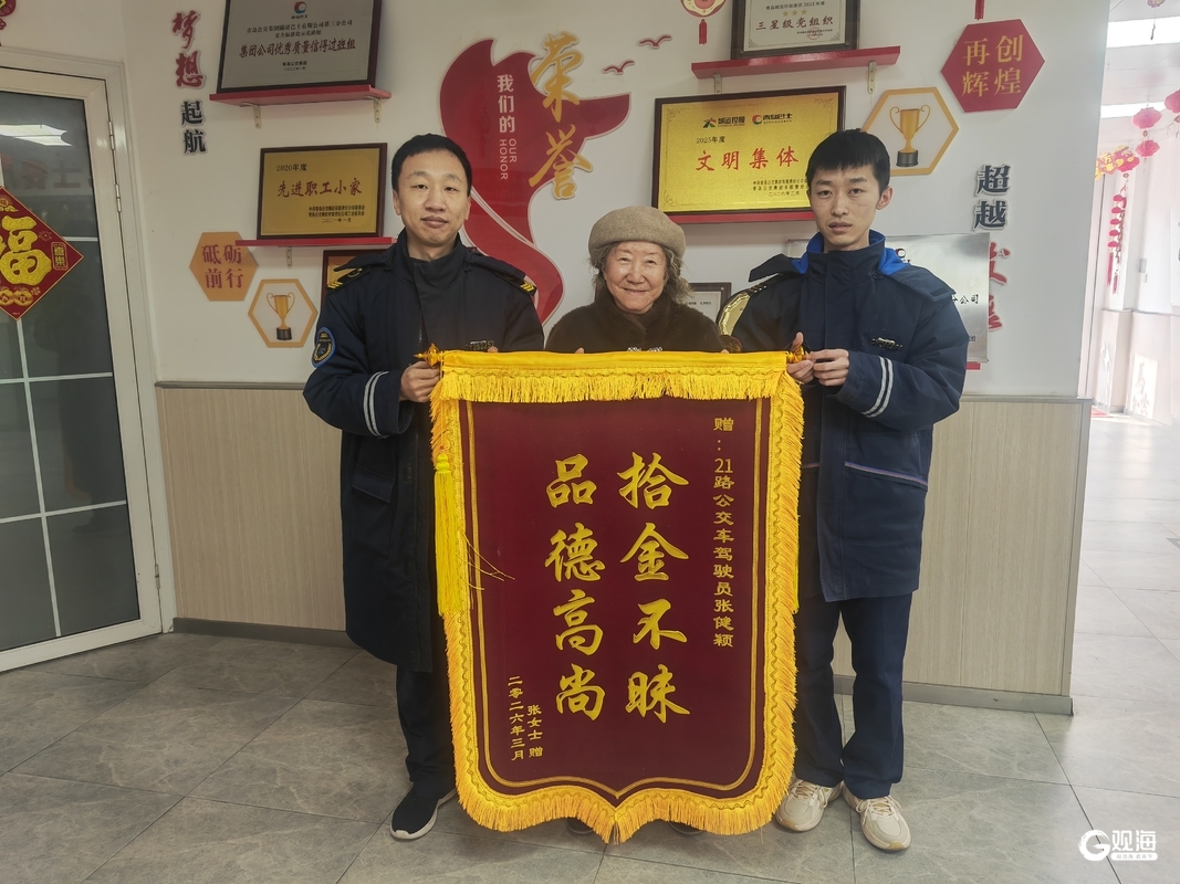 青岛日报社/观海新闻3月13日讯 一面锦旗,一份信任;一次相助,传递温情。3月13日下午,市民张女士专程来到青岛城运控股公交集团隧道巴士第三分公司,将一面绣有“拾金不昧 品德高尚”的锦旗送到驾驶员张健颖和“青岛巴士管家”王誉凯手中,感谢他们尽心尽责、热心相助,帮助自己找回了遗失的贵重挎包。
