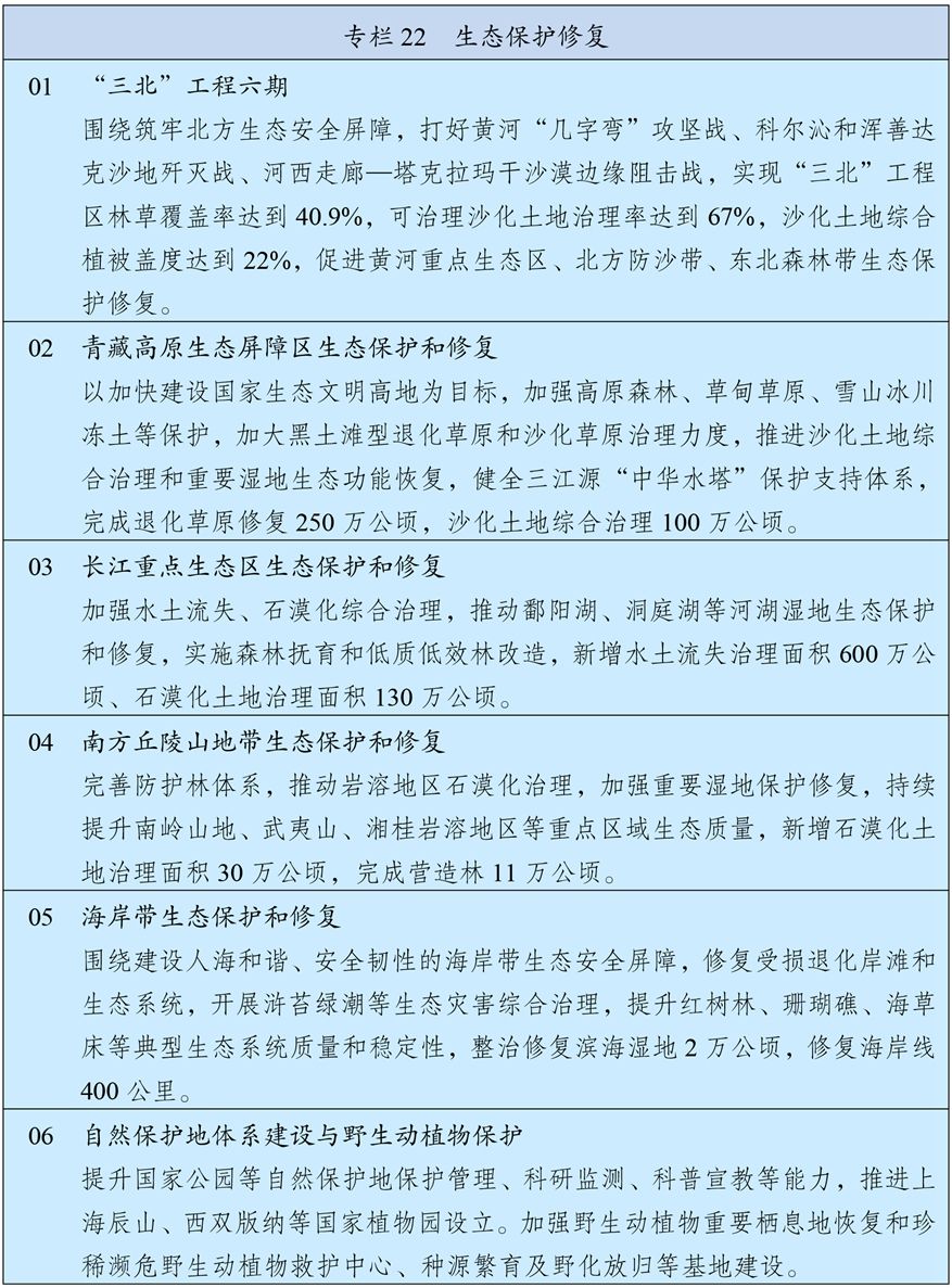 统筹推进重要生态系统保护和修复重大工程,持续巩固以“三区四带”为骨架的国家生态安全屏障体系。打好“三北”工程攻坚战,推动三大标志性战役取得决定性胜利。深入推进青藏高原生态保护,加强重点区域水土流失治理和石漠化治理。科学开展大规模国土绿化行动,推进森林质量精准提升和国家储备林建设,森林蓄积量达到224亿立方米,统筹草原生态修复与合理利用,加强湿地保护修复。推进超引地表水和超采地下水治理,开展历史遗留废弃矿山生态修复。