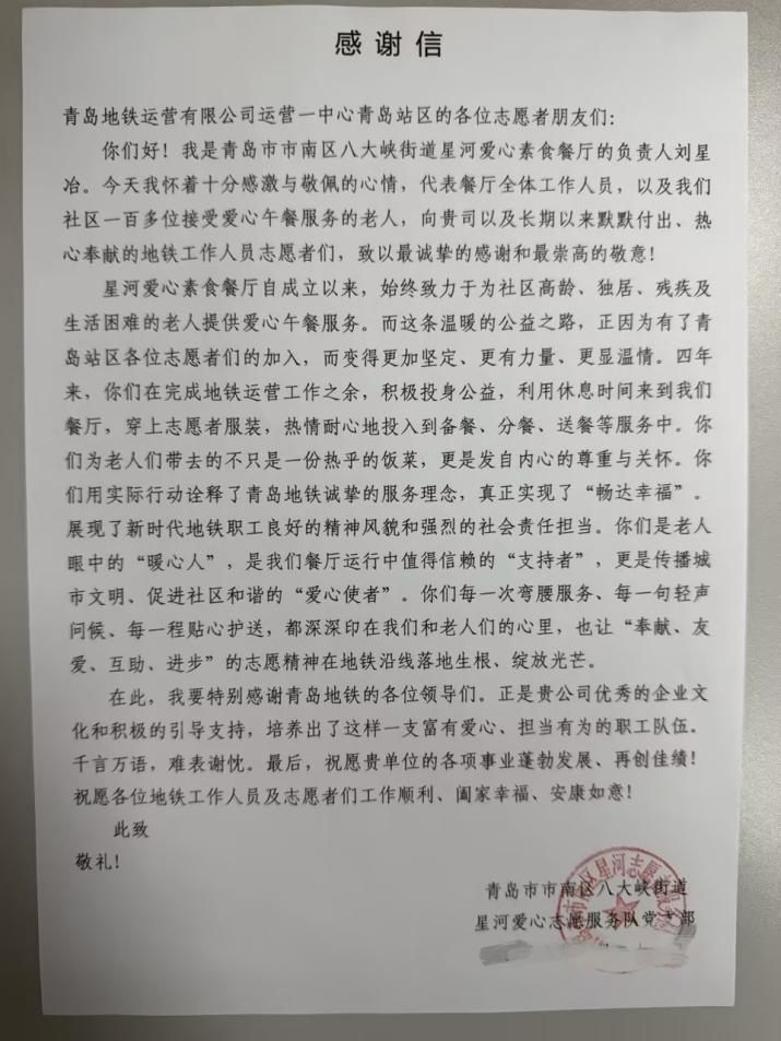 感谢信不算太长,却字字滚烫:“四年来,你们在完成地铁运营工作之余,利用休息时间来到我们餐厅,热情耐心地投入到备餐、分餐、送餐等服务中,你们为老人们带去的不只是一份热乎的饭菜,更是发自内心的尊重与关怀。”
