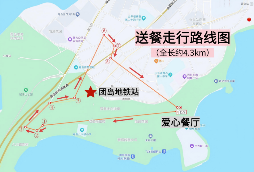 一次社区走访中,青岛地铁“山海之蓝”志愿服务队了解到餐厅的难处后,主动接过了这份暖心订单。从2021年到现在,志愿者们每周二中午都会准时出现在餐厅门口,将一份份热乎饭,送到老人的家门口。他们走过的送餐路,累计超过1000公里。这不仅仅是一组数字,更是他们一步步走进老人生活和心底的温暖足迹。