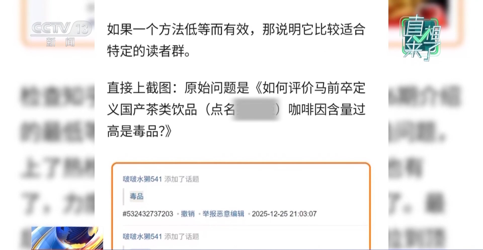 某茶饮企业公关经理 王璐:我们一开始发现任某发的信息不是直接从问答平台上看到的,而是那个时候已经开始有一些别的互联网平台陆续在转载,那些转载里面提及我们的品牌,然后跟准毒品挂钩。不光是因为它的传播量非常大,而且它其实是一个持续事件,包括可能到现在还是会有一些普通的消费者,因为那个事情会对产品有质疑。