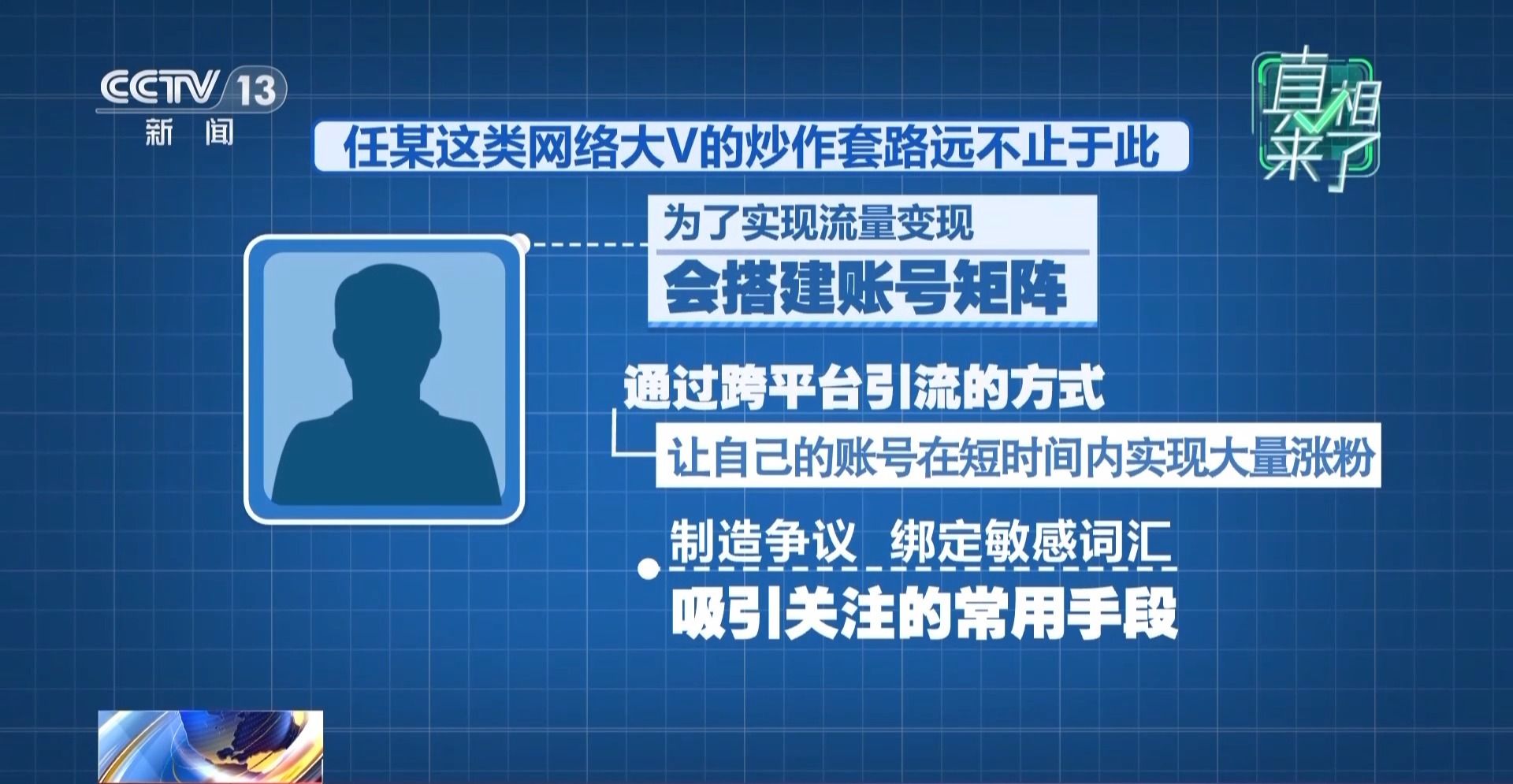 事实上,任某这类网络大V的炒作套路远不止于此,为了实现流量变现,他们会搭建账号矩阵,通过跨平台引流的方式,让自己的账号在短时间内实现大量涨粉,而制造争议、绑定敏感词汇,就是他们吸引关注的常用手段。