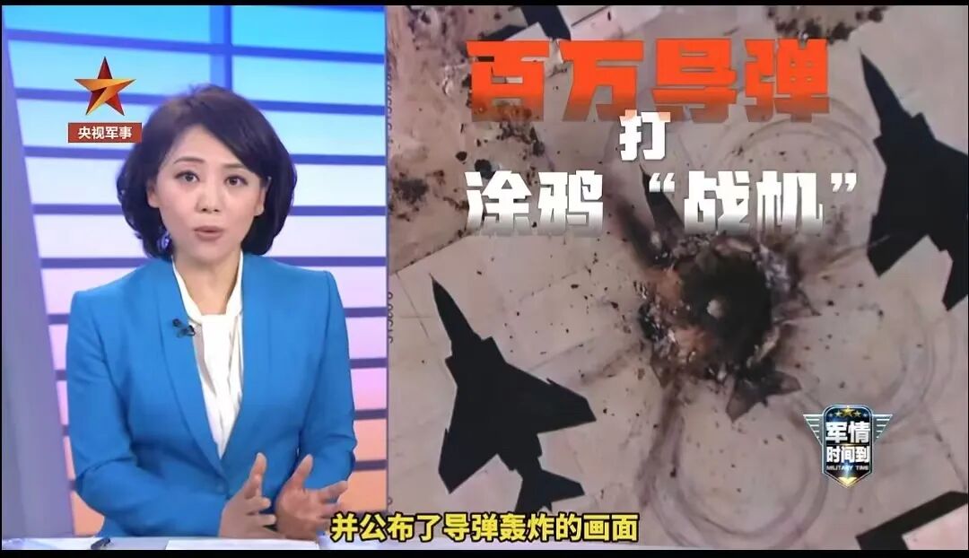 画面中,被炸“战机”纹丝不动,显然是画在停机坪上的涂鸦。