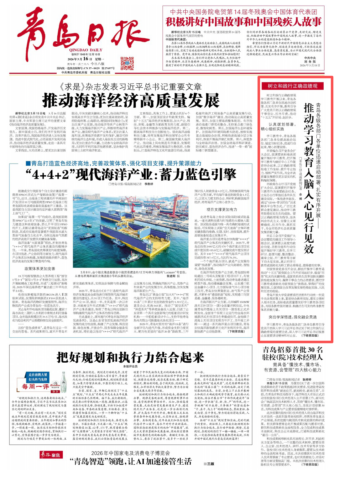 青岛日报2026年3月16日1版